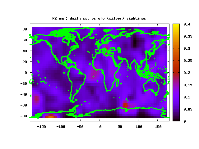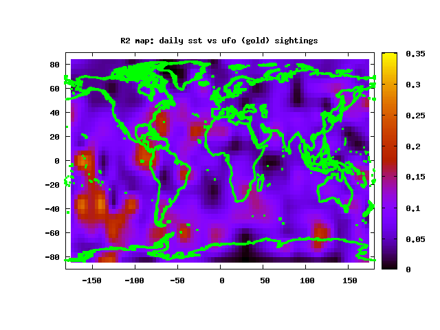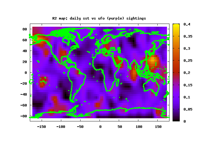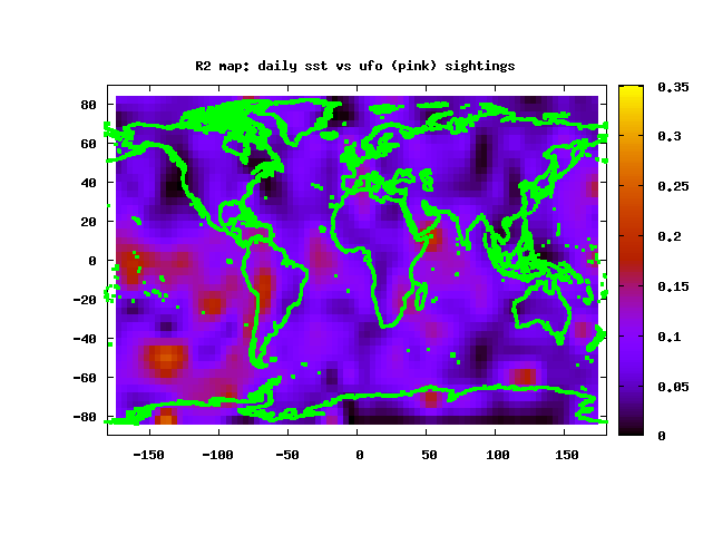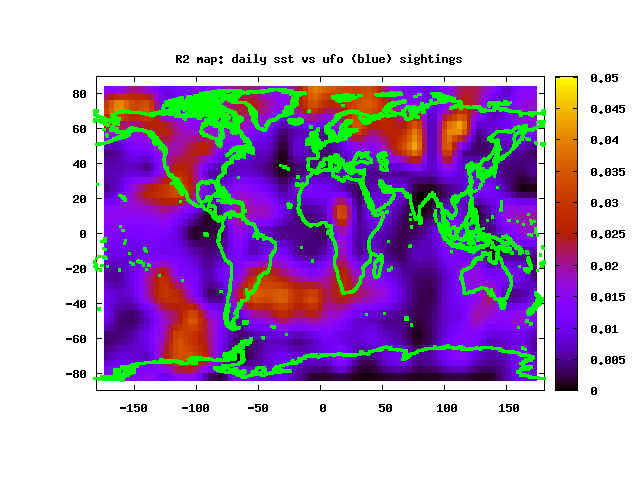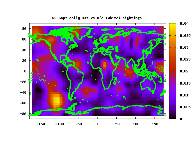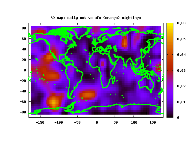 Remote locations where daily SST correlate significantly with UFO sightings as seen mostly across N Am within the following several days (NUFORC 2006-2023).