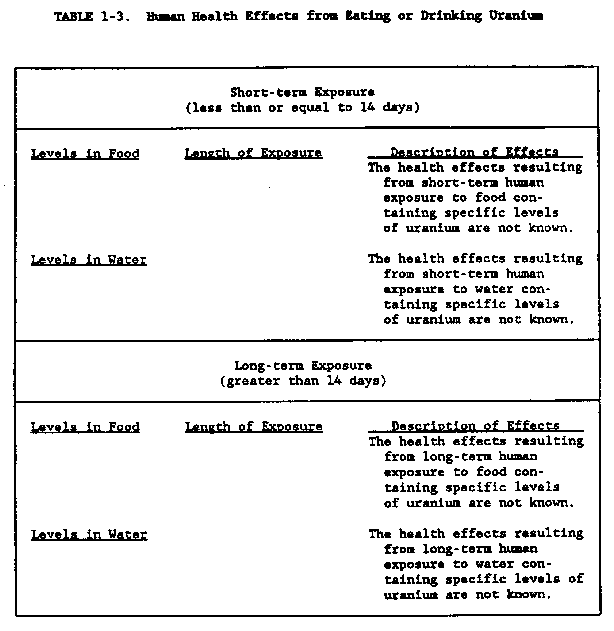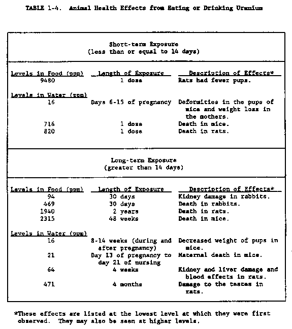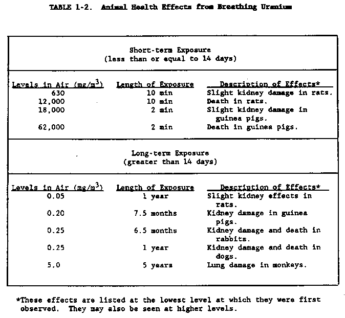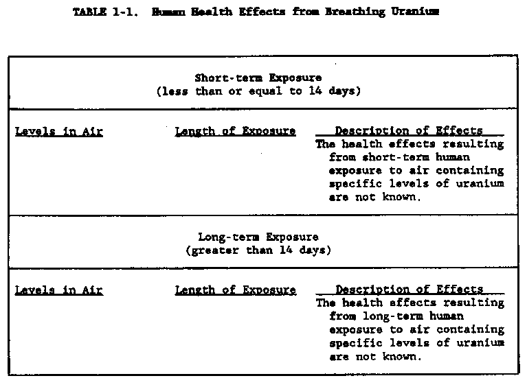 Tables 1-1, 1-2, 1-3, and 1-4 show the relationship between uranium and known health effects.